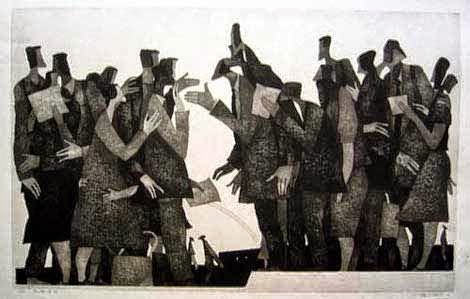 Tetsuo Aoki is a Japanese wood engraver whose black & white characters are elongated or stretched. His graphic style is unique, clear shapes, black and white dresses with little shadowing ... There is something impressive in these kinds of "zombies" that show an attitude so sad ...