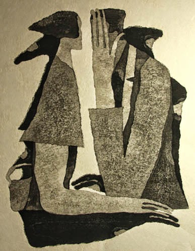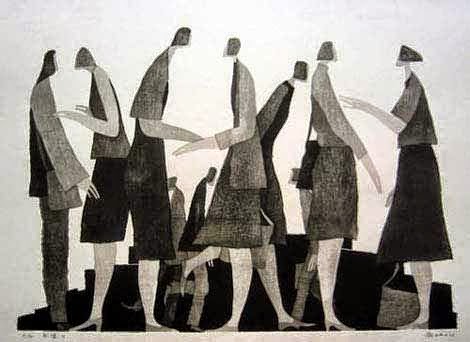 Tetsuo Aoki est un graveur sur bois japonaise dont les personnages noirs & blancs sont allongés, voire étirés. Son style graphique est unique, des formes claires, robes noires et blanches avec peu ombrage... Il y a quelque chose d'impressionnant dans ces sortes de "zombis" qui affichent une attitude si triste...